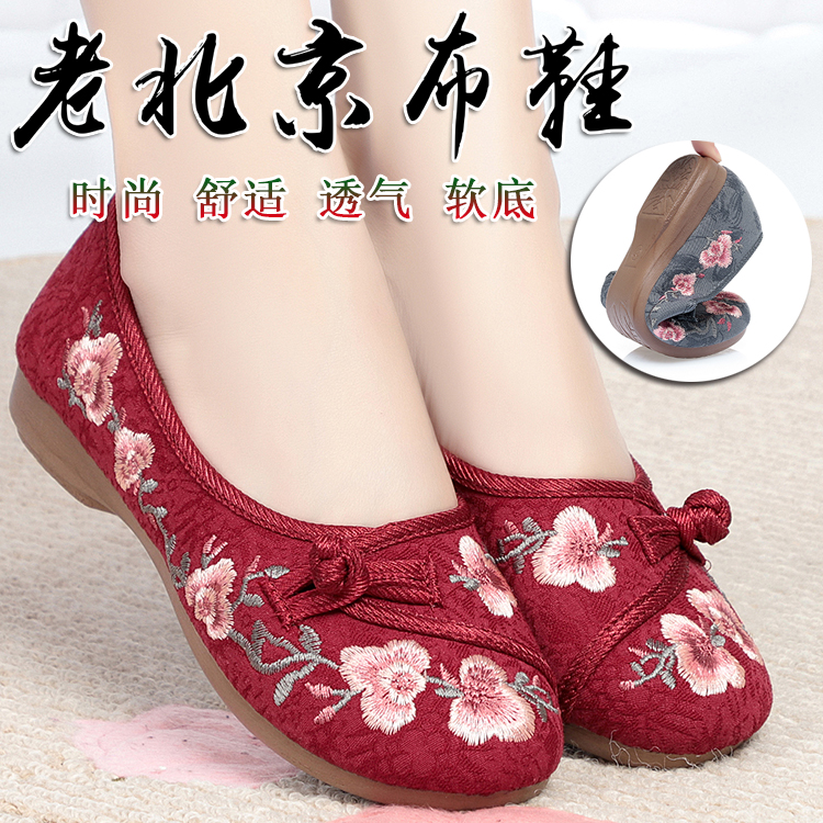 中國(guó)風(fēng)老北京布鞋 繡花鞋 女布鞋 軟底舞蹈鞋 淺口春夏 坡跟 漢服古風(fēng)