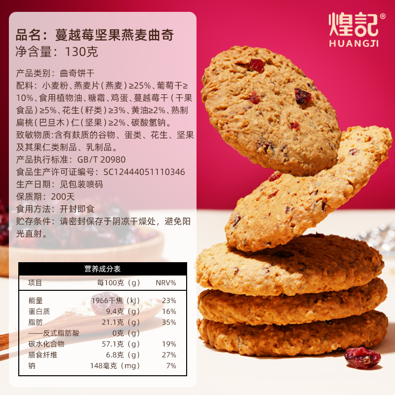為您提供商品煌記蔓越莓堅果燕麥曲奇餅干黑巧克力山拇休閑飽腹高膳食纖維零食的詳細介紹,