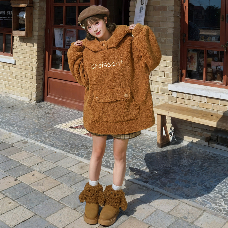女裝 森女部落原創(chuàng)搞怪可頌造型絨衫 2025年新款 秋冬款 套頭衛(wèi)衣絨衫