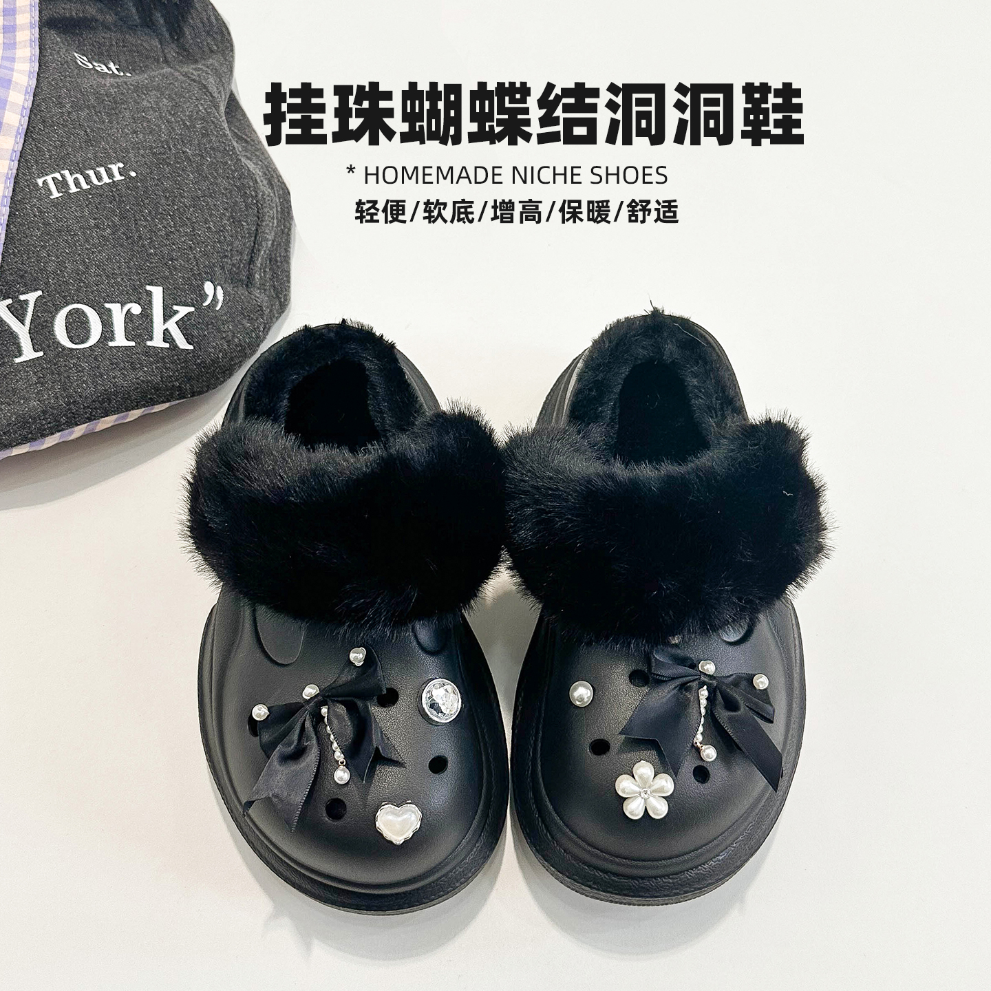 外穿厚底增高5cm洞洞鞋 女士一腳蹬拖鞋 黑色加絨保暖棉拖鞋 女冬季抖音小紅書同款網(wǎng)紅熱銷 - 毛毛鞋 - 淘寶網(wǎng)