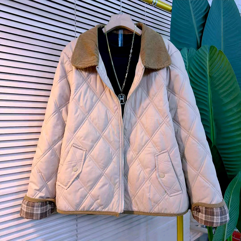 翻領(lǐng)菱形拼接棉服外套大碼 2025年冬季 韓版 女裝 新款 胖mm寬松上衣女
