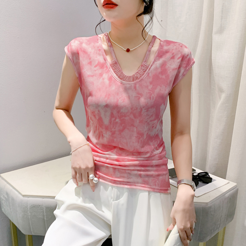 網(wǎng)紗小衫 氣質(zhì)水墨畫印花上衣女夏裝 性感V領(lǐng)掛脖釘珠短袖 T恤修身 潮