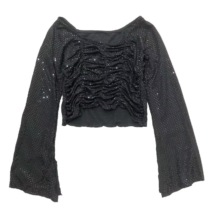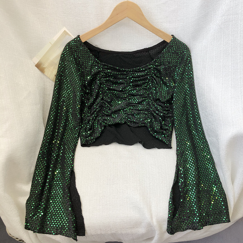 襯衫 歐美風(fēng)一字領(lǐng)露肩褶皺喇叭袖 長袖 閃閃燙鉆亮片套頭短款 上衣女