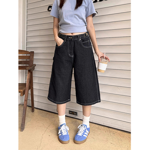 新款 雯雯小超人 女2025夏季 高腰顯瘦七分褲 復(fù)古寬松闊腿牛仔短褲