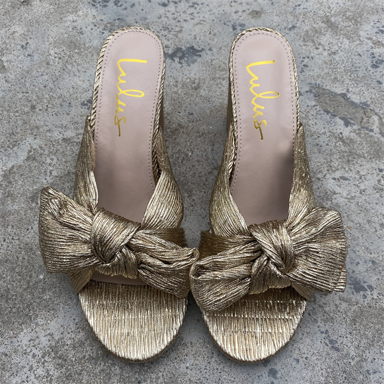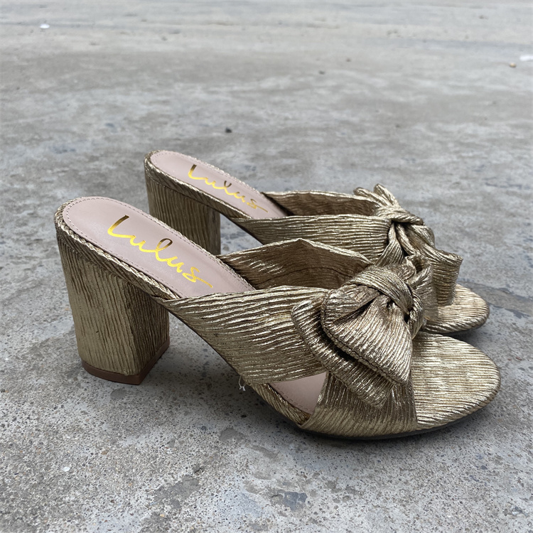 美國單2023歐美新款 女 粗跟外穿涼拖鞋 金色一字型蝴蝶結(jié)露趾高跟鞋