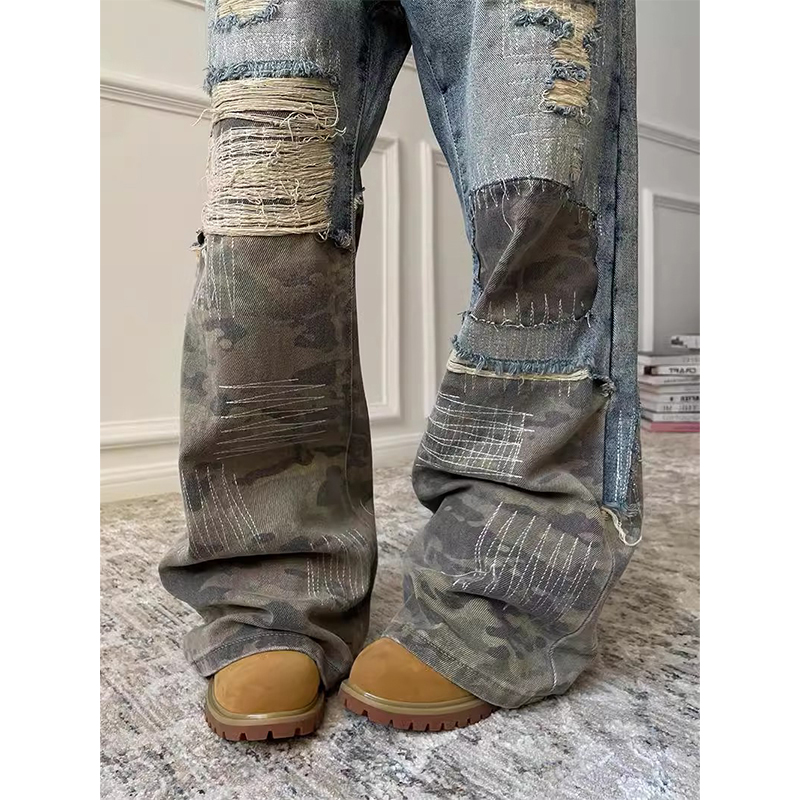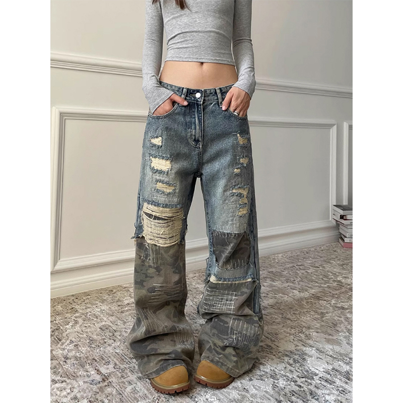 為您提供商品新款 美式 女2025春季 高腰直筒闊腿褲 寬松迷彩拼接破洞微喇牛仔褲 子的詳細(xì)介紹,