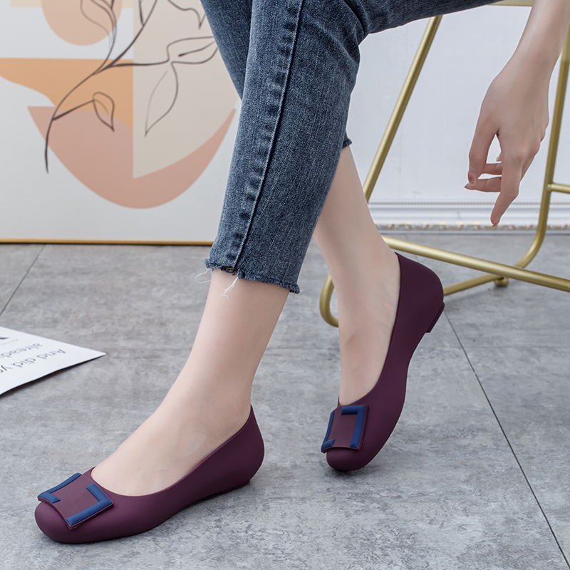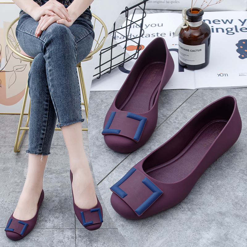 塑膠方扣磨砂軟膠防水休閑鞋 2024夏季 新款 包頭拼色平底果凍雨鞋 女