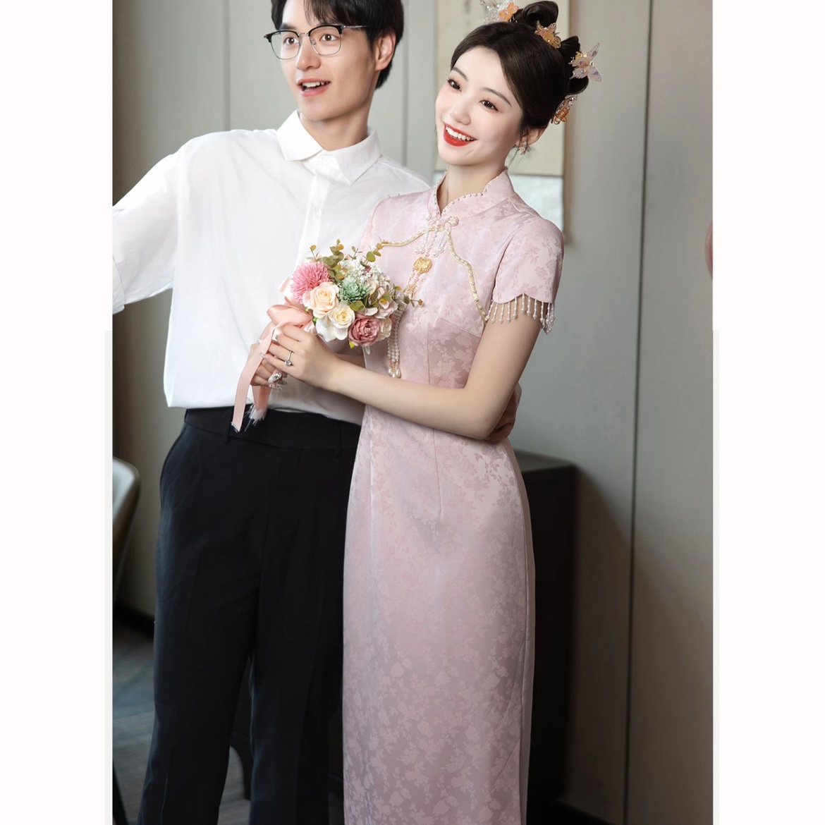 長款 粉色立領(lǐng)新中式 改良旗袍敬酒服小個(gè)子年輕款 出閣嫁衣回門便裝