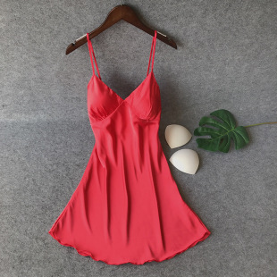 薄荷曼波色春夏性感吊帶睡裙女V領(lǐng)帶胸墊緞面仿絲綢雪紡純色內(nèi)搭