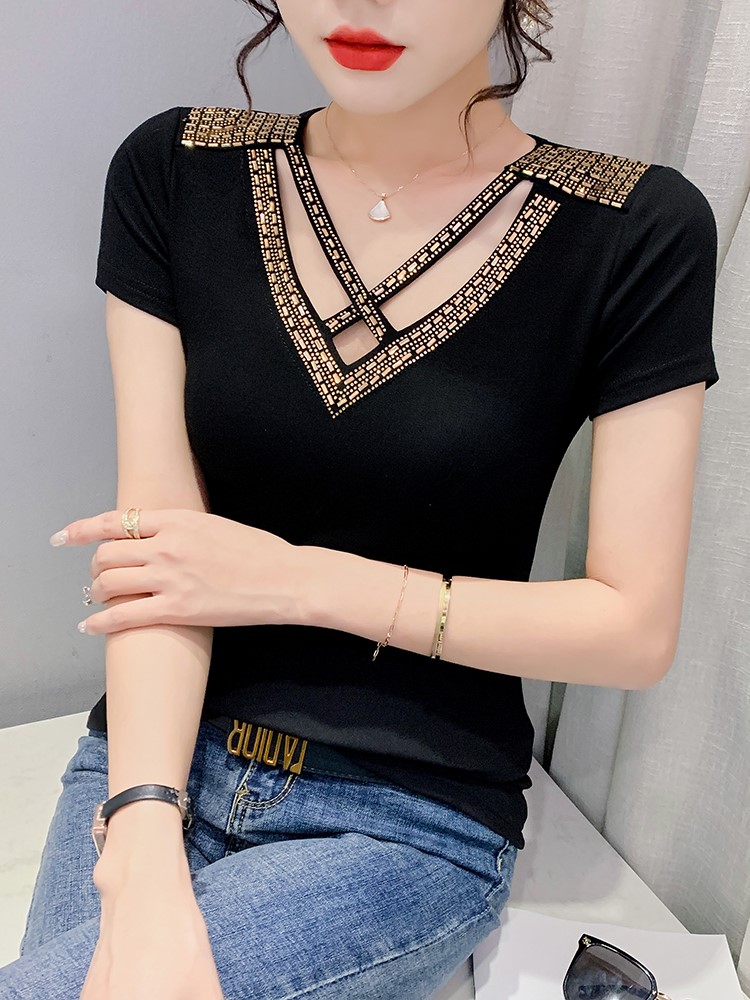 小衫 潮性感鏤空V領(lǐng)T恤短袖 歐貨燙鉆洋氣上衣半袖 女裝 2024新款 夏季抖音小紅書(shū)同款網(wǎng)紅熱銷(xiāo) - T恤 - 淘寶網(wǎng)