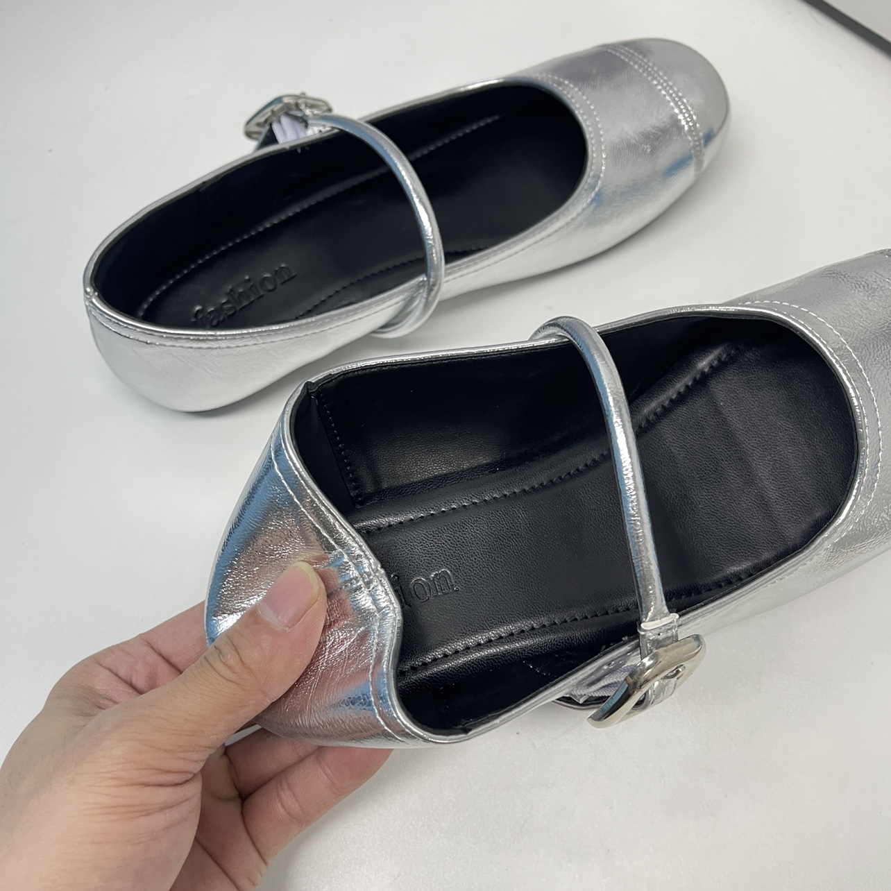 子2025春秋新款 仙女平底豆豆鞋 配裙子瑪麗珍鞋 銀色小皮鞋 女鞋 法式