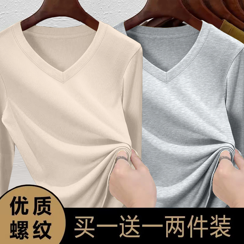 舒適T恤上衣打底衫 顯瘦長袖 兩件休閑女裝 純色大碼 螺紋v領(lǐng)修身 單抖音小紅書同款網(wǎng)紅熱銷 - T恤 - 淘寶網(wǎng)
