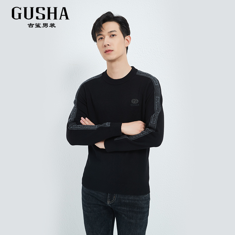 男修身 古鯊黑色綿羊毛撞色通勤羊毛衫 保暖圓領(lǐng)毛衣冬季 清倉 新
