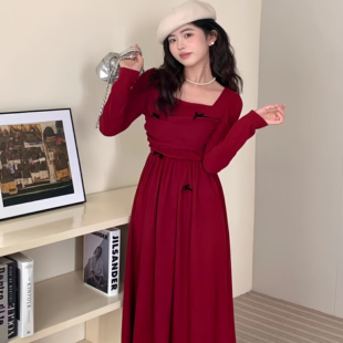 白裙長袖 新款 赫本風法式 連衣裙女收腰氣質(zhì)顯瘦中長裙