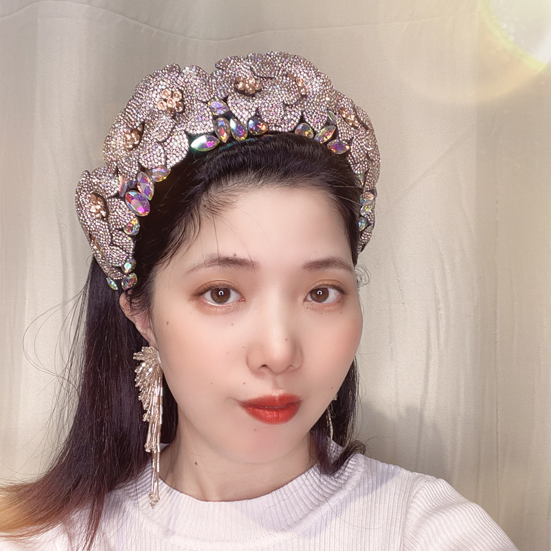原創(chuàng)韓粉色閃鉆雙花發(fā)箍女高顱頂帶齒鑲鉆發(fā)卡女寬邊水鉆花朵頭箍