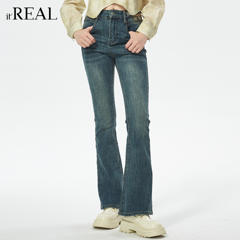 復(fù)古牛仔微喇褲 美式 女設(shè)計(jì)感顯瘦喇叭褲 real瑞爾秋新款
