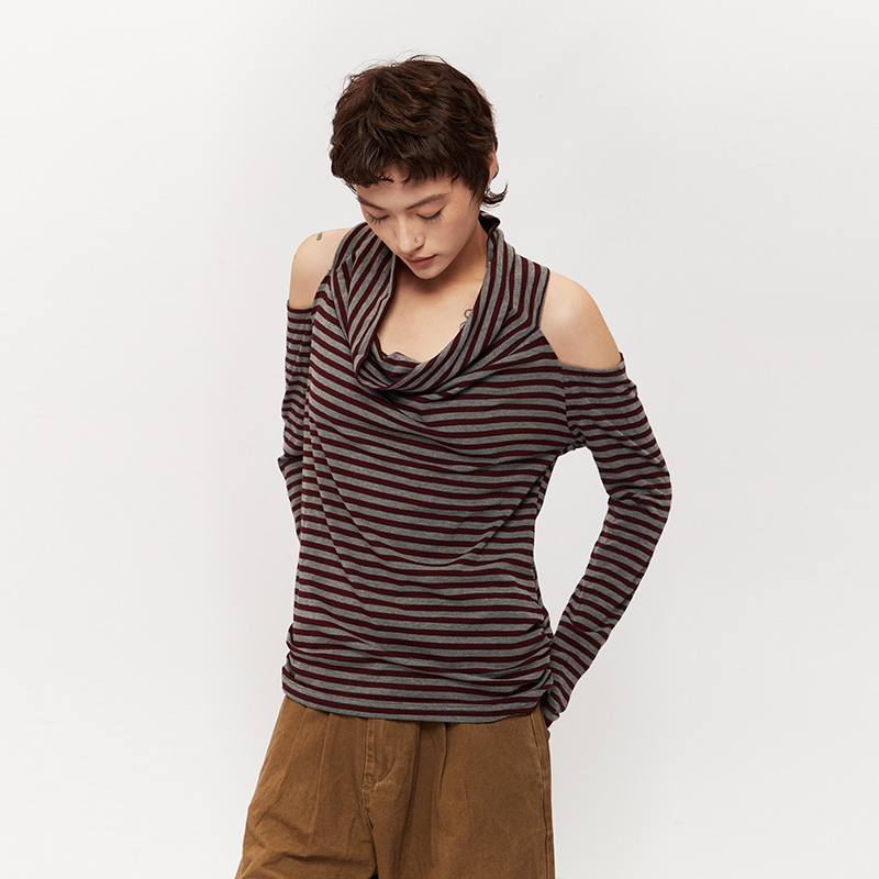 T恤女修身 AIRHOOD2025秋季 美式 復(fù)古條紋蕩領(lǐng)露肩長袖 顯瘦辣妹上衣