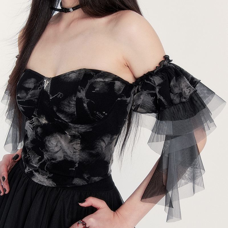 茶祭玫瑰 VOCK 暗黑宮廷小眾設(shè)計(jì)感抹胸網(wǎng)紗一字肩上衣辣妹胸衣女