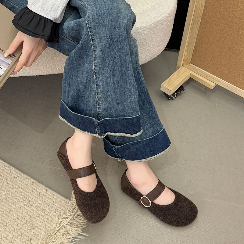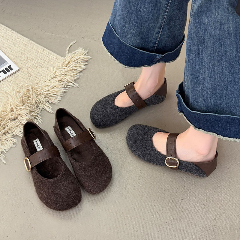 毛呢灰色勃肯鞋 巨好看平底淺口單鞋 秋季 瑪麗珍晚晚鞋 女2025新款 子