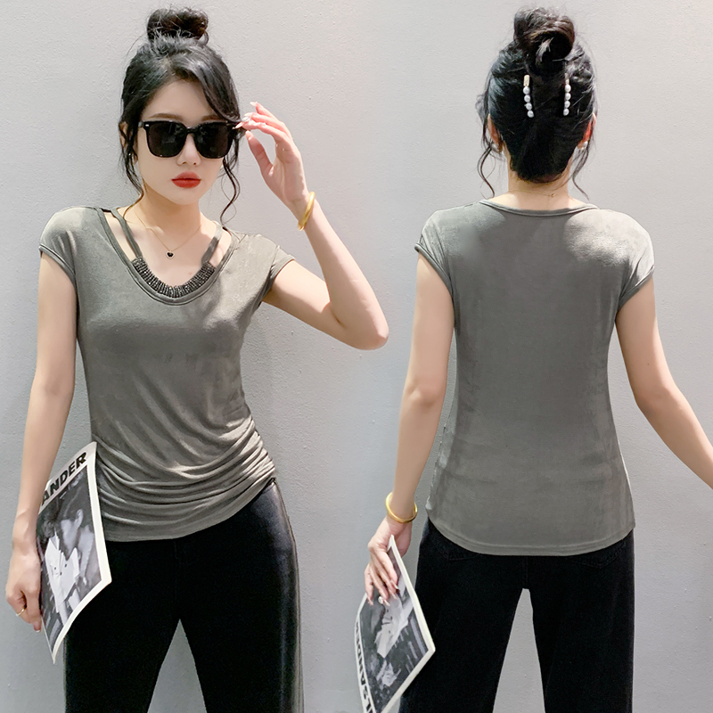 v領重工釘珠短袖 t恤女裝 新款 洋氣百搭顯瘦上衣潮別致小衫 時尚 夏季