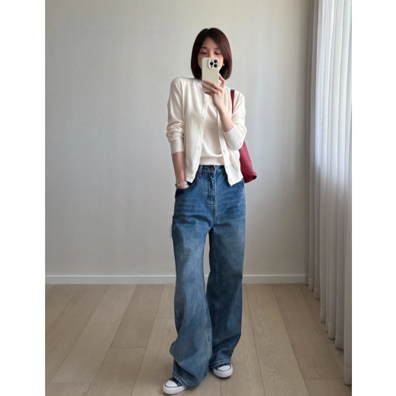 顯瘦寬松垂感窄版 復(fù)古藍(lán)色高腰闊腿牛仔褲 新款 直筒拖地褲 女秋冬季
