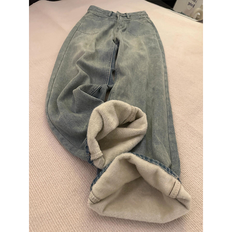 復(fù)古藍(lán)直筒牛仔褲 顯瘦梨形身材寬松闊腿褲 女秋冬加絨加厚胖mm大碼