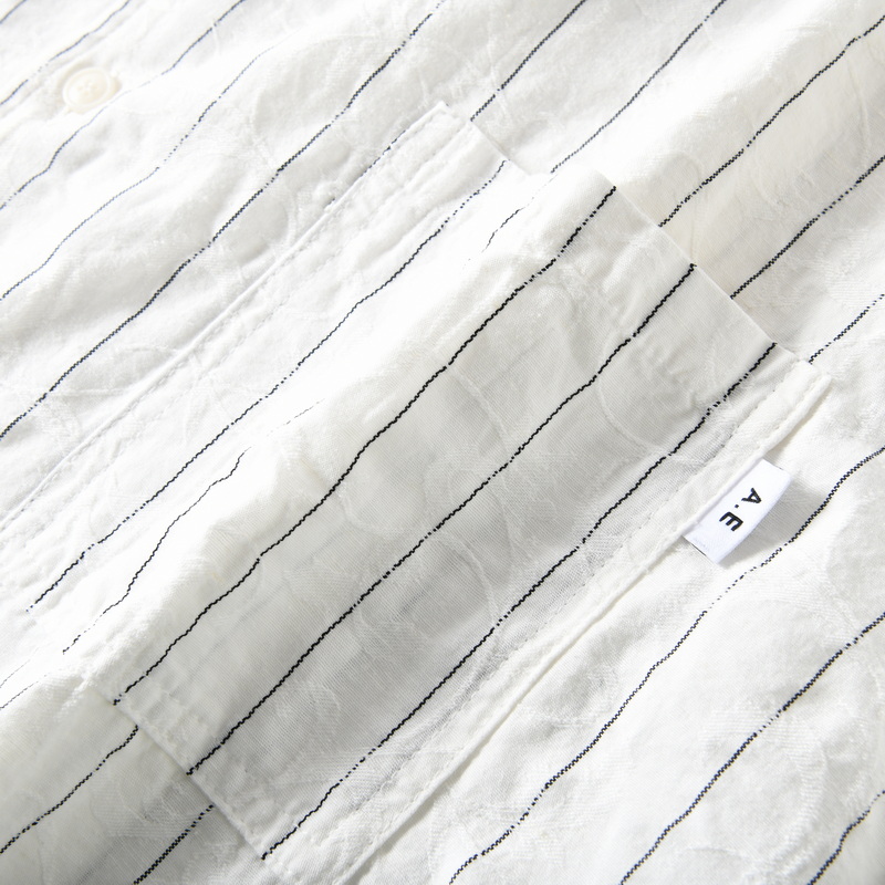 男款 美式 襯衫 夏季 復(fù)古棉麻條紋提花透氣寬松休閑古巴領(lǐng)短袖 白襯衣