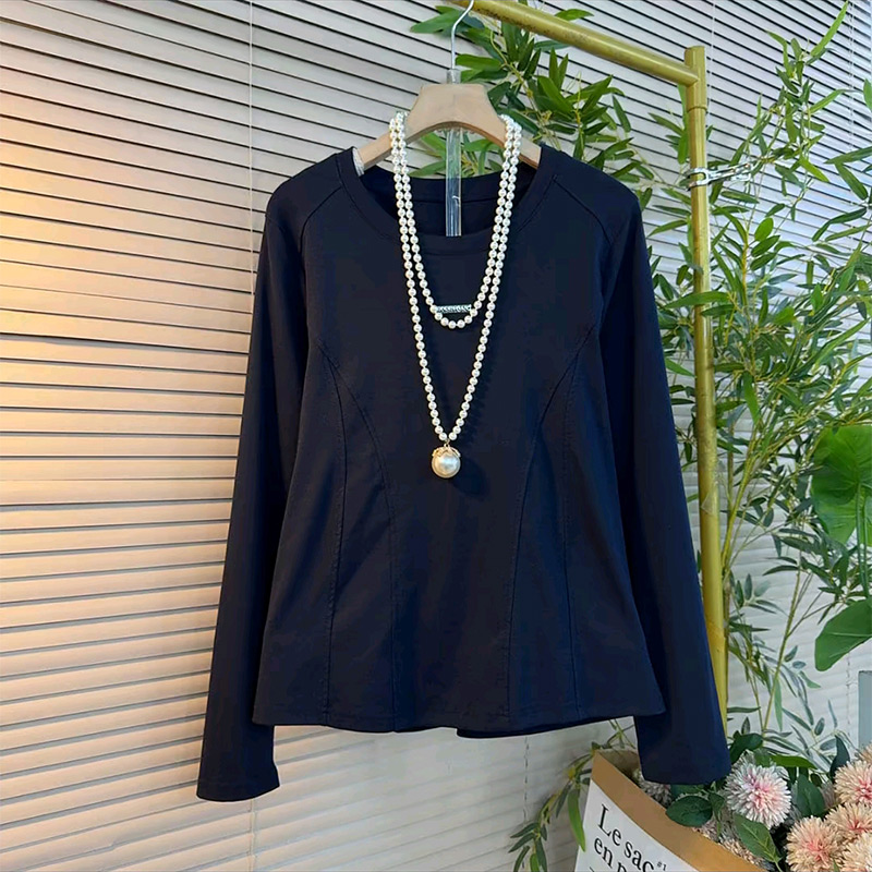 衫 大碼 新款 女裝 胖妹妹休閑簡約純色T恤 拼接圓領(lǐng)長袖 歐貨2025秋季