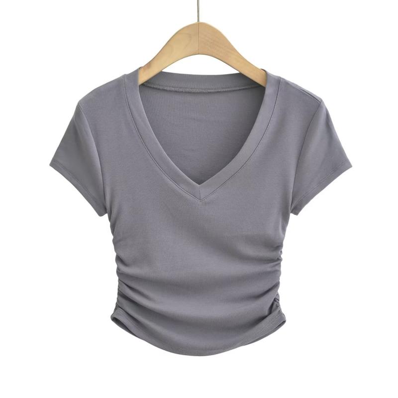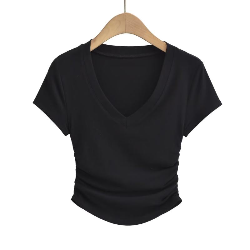 辣妹基礎(chǔ)T汗衫 青春少女系V領(lǐng)短袖 女t恤法式 純欲抽褶設(shè)計(jì)百搭短款