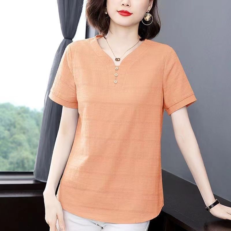 2025新款 純色減齡上衣女短袖 t恤純棉v領(lǐng)洋氣寬松中年媽媽小衫 夏裝