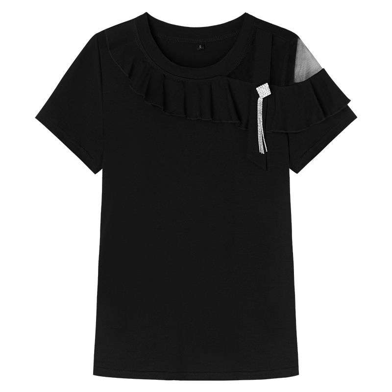 純棉t恤女夏短袖 女 網(wǎng)紗荷葉邊露肩上衣圓領(lǐng)黑色體恤衫 2022年新款