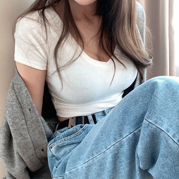 顯胸大t恤女白色高腰短款 小衫 夏裝 露臍上衣緊身V領(lǐng)短袖 跳舞瑜伽服抖音小紅書同款網(wǎng)紅熱銷 - T恤 - 淘寶網(wǎng)