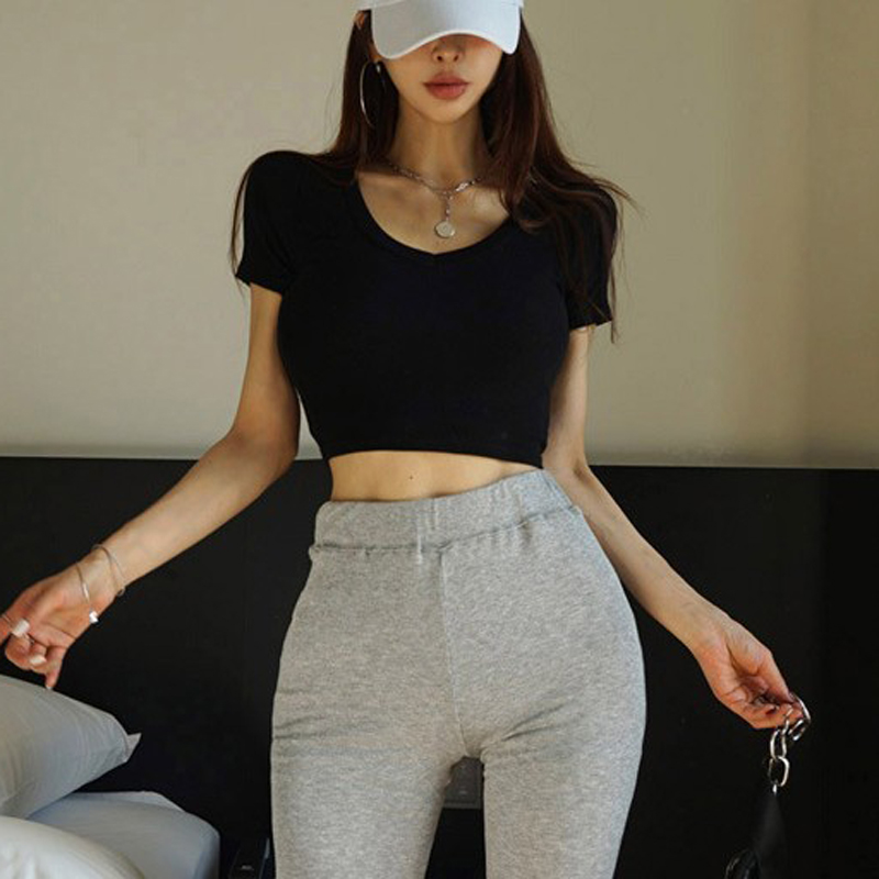 小衫 夏裝 露臍上衣緊身V領(lǐng)短袖 顯胸大t恤女白色高腰短款 跳舞瑜伽服
