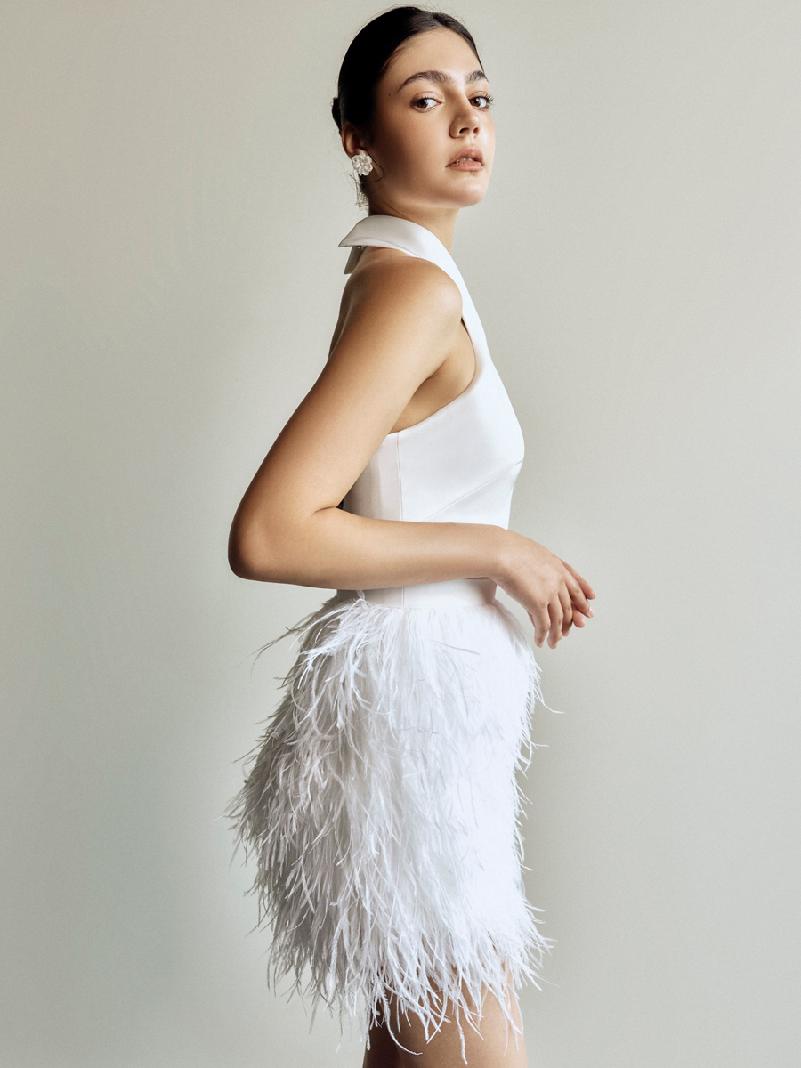 高檔精品掛脖設(shè)計鴕鳥毛超短流蘇輕奢華麗感白色收腰顯瘦小禮服