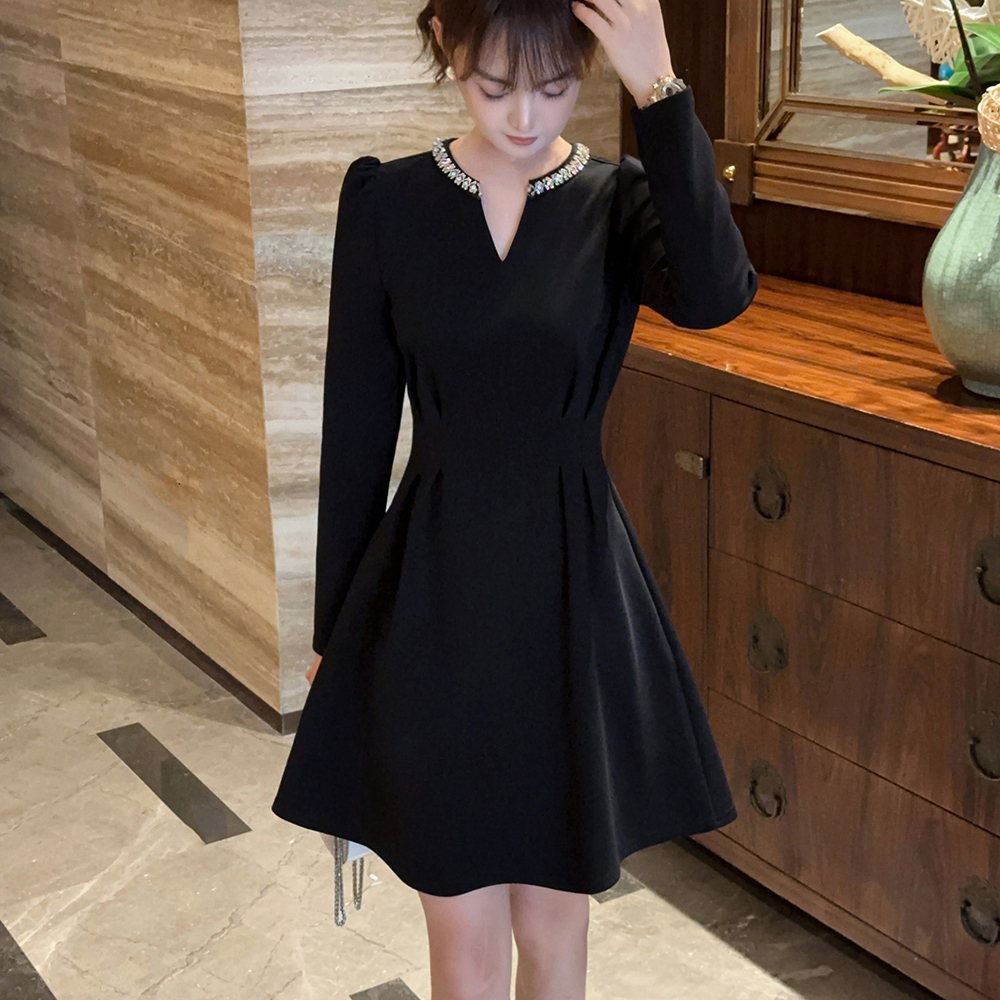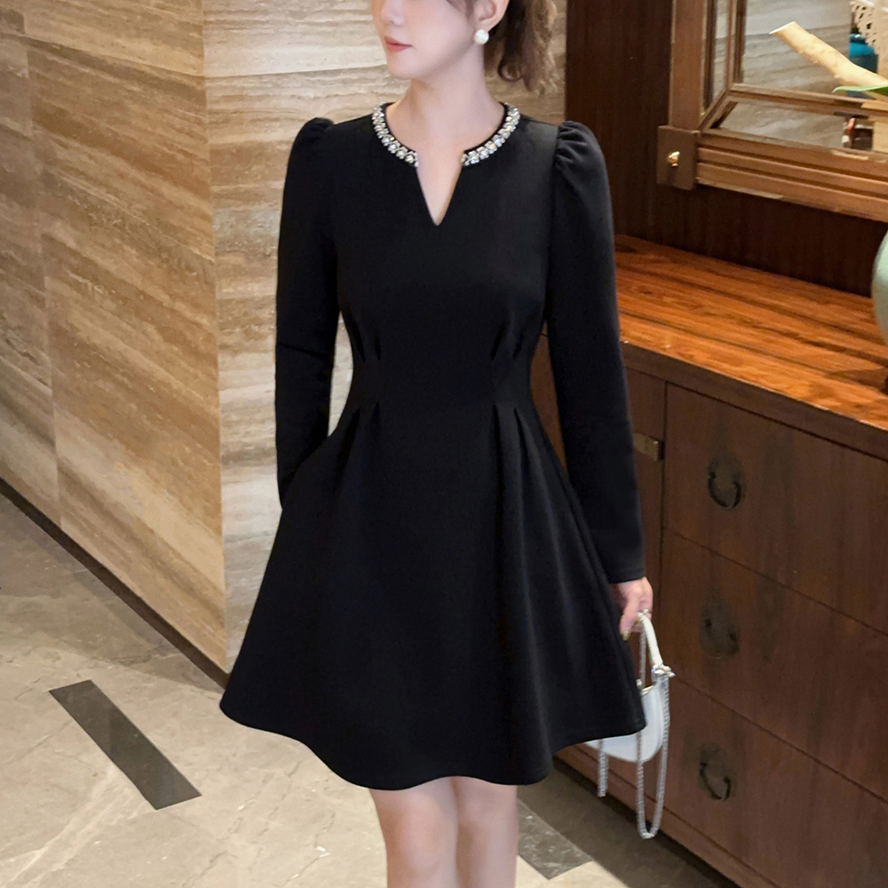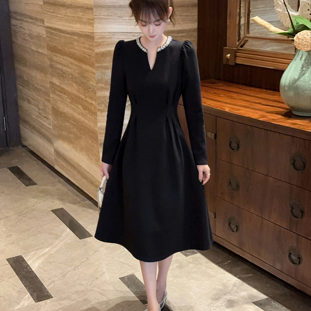 2025年重工洋氣黑色連衣裙子V領(lǐng)釘珠赫本風(fēng)小個(gè)子a字法式 長(zhǎng)裙顯瘦