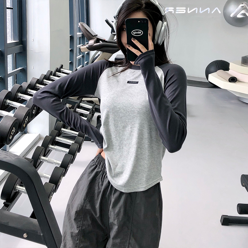 annerun撞色內(nèi)搭運動T恤女修身 瑜伽長袖 顯瘦上衣甜辣妹外穿打底衫