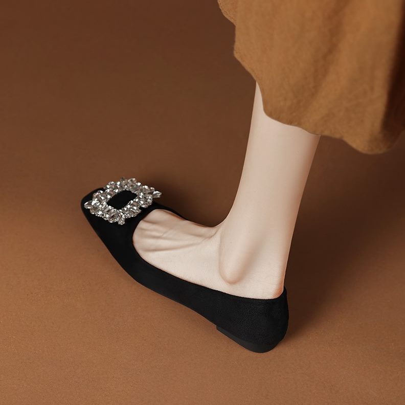 法式 低跟方頭水鉆單鞋 平底黑色小皮鞋 女鞋 子 通勤晚晚鞋 2023年春季