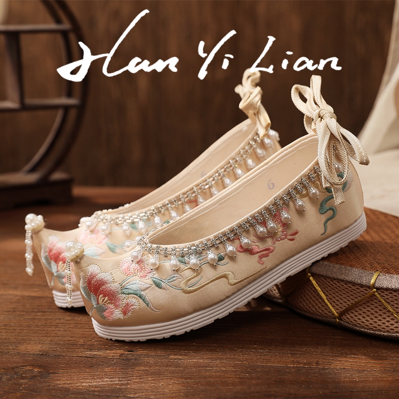 鞋 春秋原創(chuàng)國風(fēng)漢服鞋 搭配古裝 內(nèi)增高翹頭弓鞋 子女古風(fēng)繡花鞋 淡雅