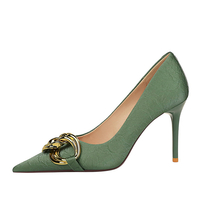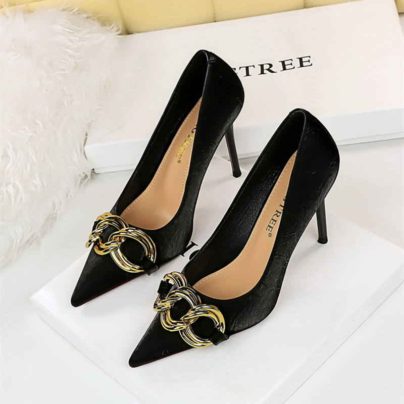 單鞋 歐美鏈條扣細(xì)跟高跟鞋 女綢緞淺口尖頭職業(yè)OL工作鞋 金屬扣大碼
